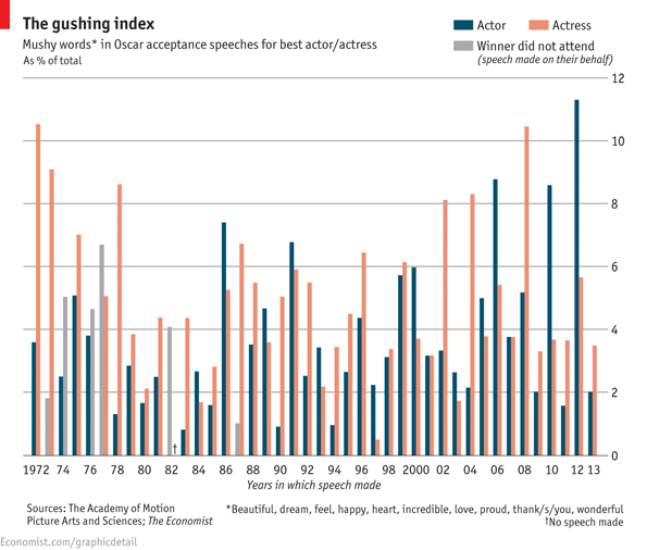 At yesterday’s Oscar Academy Awards ceremony, various actors and filmmakers delivered emotional acceptance speeches littered with thanksgiving, superlatives, and mushy words. The Economist asks the whimsical question of whether the Best Actors and Actresses have progressively delivered more gushing speeches since 1972. To answer this question, the publication introduced the “gushing index”, which is calculated by measuring the frequency by which awardees used gushing words (e.g. beautiful, dream, happy, thank you, etc) as a fraction of total words contained in their acceptance speeches.