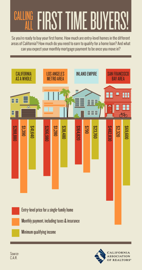 The recent real estate bubble and foreclosure crisis that California faced has left first-time home buyers wondering how much home they can really afford. With the relatively lower current prices and record low interest rates, the California Association of Realtors (C.A.R.) is suggesting it’s an opportune time to buy. C.A.R. published the following chart that illustrates statistics for the California market such as: (i) entry-level price for a single family home, (ii) monthly payment, including taxes and insurance, and (iii) minimum qualifying income.